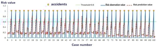 Figure 14 shows that a predicted dynamic risk value of greater than 0.6 typically accompanied an accident occurrence. Therefore, an accident prediction threshold of 0.6 could be established, where a risk value surpassing this threshold signifies an impending accident. For the selected 150 evaluation samples with accidents, using 0.6 as the prediction threshold resulted in 116 predicted accidents, yielding a forecasting accuracy of 77.3%. By contrast, of the 300 evaluation samples without accidents, only 17 were wrongly predicted as accidents, resulting in a false alarm rate of merely 5.7%. The modeling and results could be applied to real-time traffic operational risk monitoring to facilitate the prediction of road accidents.