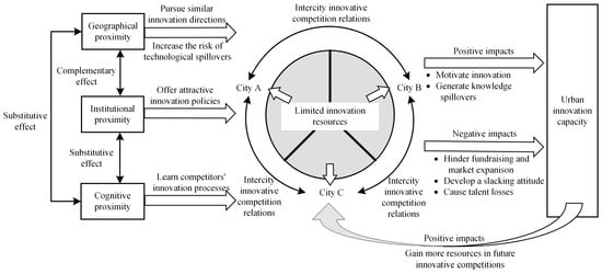 Intercity innovative competition relation is a double-edged sword for urban innovation capacity while urban innovation capacity serves as the driving force behind intercity innovative competition relations. On the one hand, the existence of competitors encourages cities to consistently pursue innovation. Cities will attempt to comprehend the innovation patterns of their competitors, engage in imitation and learning, and generate knowledge spillovers in this process [10], all of which will promote urban innovation capacity. On the other hand, excessive competitions will weaken cities’ strengths in financial support and market expansion, making them difficult to achieve significant innovation [8,9]. Excessive competitions may also lead to a loss of confidence and a slacking attitude, thereby hindering innovation [13]. Meanwhile, as the results of competitions can be won or lost, some cities may experience talent losses after failing in innovative competitions, leading to a decrease in their innovation capacities [14]. Urban innovation capacity, as the driving force of intercity innovative competition relations, provides cities with sufficient advantages to launch new rounds of innovative competitions, enabling them to gain more resources in future innovative competitions, which further promotes the formation of intercity innovative competition relations.