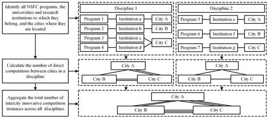 As the funding for a general program of NSFC is mostly around 600,000 RMB, with a generally balanced allocation, this study used the number of direct competitions between programs in different cities as the weight to construct intercity innovative competition relations in China. As illustrated in Figure 2, the first step is to identify all NSFC programs, the universities and research institutions to which they belong, and the cities where they are located. The second step is to calculate the number of direct competitions between cities in a discipline. Since programs will compete with other programs in the same discipline for limited funding, if there are m programs located in city i and n programs located in city j within a particular discipline, then city i and city j would have engaged in m × n innovative competition instances in that discipline. Finally, the total number of intercity innovative competition instances across all disciplines is aggregated to construct the intercity innovative competition relations in China.