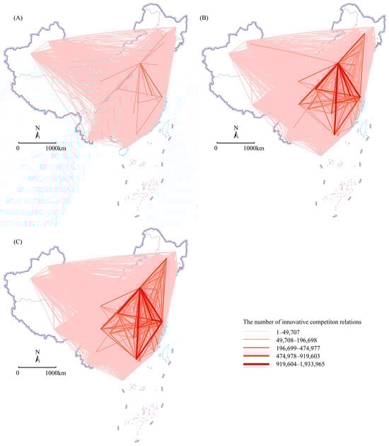 Layout of intercity innovative competition relations in China from 2005 to 2019. (A) 2005–2009; (B) 2010–2014; (C) 2015–2019.