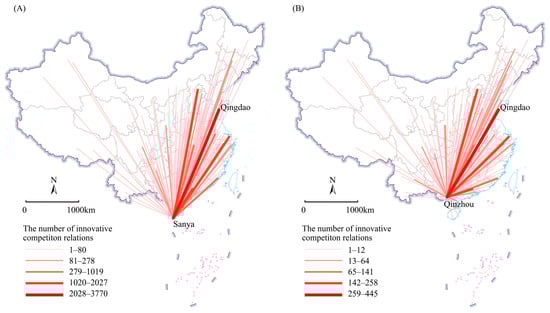 Apart from cities that serve as scientific and cultural centres that possess strong innovative competitiveness, some cities have evolved as leaders in innovative competitions by competing on the basis of their disciplinary strengths. Table 5 shows that in 2010–2014 and 2015–2019, two cities’ universities and research institutions competed strongly with those in Qingdao. They are Sanya in Hainan Province and Qinzhou in Guangxi Province (Figure 4). Based on an examination of the particular disciplines in which Qingdao and the two cities’ universities and research institutions engaged in innovative competitions, it is discovered that from 2015 to 2019, the field of marine science saw the highest concentration of innovative competitions between Qingdao’s universities and research institutions and those in Sanya and Qinzhou, at 97.45% and 75.06%, respectively. Qingdao, Sanya and Qinzhou are located on the coast, with abundant marine resources and well-developed marine industry chains. Therefore, universities and research institutions of these cities have more practical opportunities for marine technology innovation, resulting in fierce innovative competitions. This finding indicates that cognitive proximity is also a significant factor in shaping intercity innovative competition relations in China. More importantly, Qingdao has risen to the top of innovative competitions by leveraging its strengths in the field of marine science, demonstrating that cities have the potential to become benchmarks in innovative competitions in specific fields by fully leveraging their disciplinary strengths in competitions. This finding opens up new development opportunities for cities with special disciplinary advantages.