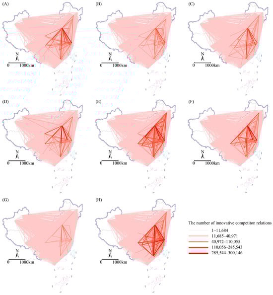 Layout of intercity innovative competition relations among various academic departments in China from 2015 to 2019. (A) Mathematical and Physical Sciences; (B) Chemical Sciences; (C) Life Sciences; (D) Earth Sciences; (E) Engineering and Materials Sciences; (F) Information Sciences; (G) Management Sciences; (H) Medical Sciences.