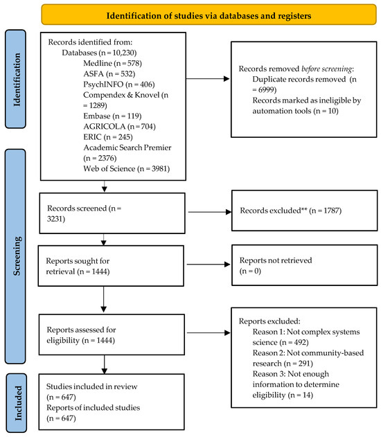 While this example pertains to nutrition and public health, numerous instances can be found in diverse fields such as environmental science [17,18], healthcare [19], medicine [20], and food systems [21], among others. More recently, journal Special Issues have been dedicated to the overlap between CSS and CBR [22]. Despite the growing utilization of these combined approaches, their deployment and impact remain relatively unexplored, with no existing scoping review encompassing both CSS and CBR [4]. Exploring the overlap between CSS and CBR can uncover synergies and complementarities between these two fields, leading to more integrated and holistic solutions to complex problems. Exploring the overlap between these fields can also inspire the development of novel research methodologies and tools that are tailored to address complex real-world challenges. A comprehensive search conducted on 1 September 2019 across various databases yielded no scoping protocol or review specifically focusing on the integration of CSS and CBR, although a related systematic review explored community participation in health systems research [23]. However, this review did not treat CSS and CBR as distinct bodies of literature and primarily concentrated on health systems.