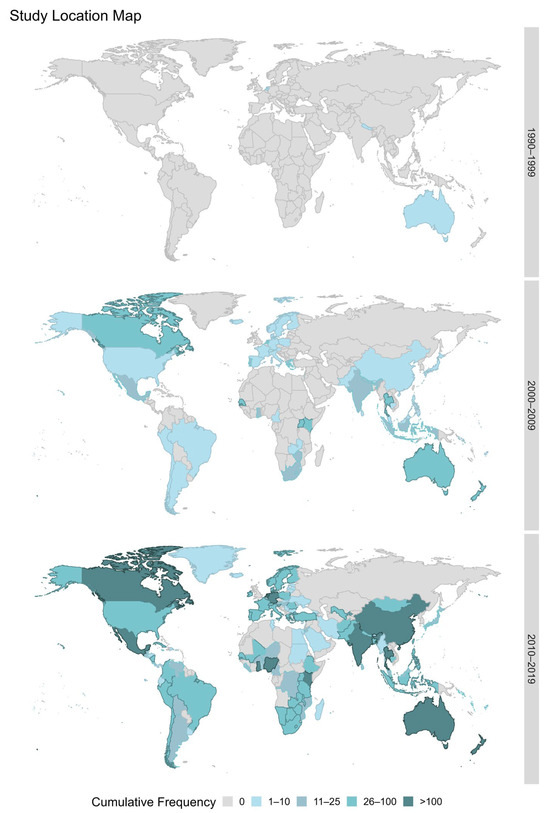Without distinguishing between CSS and CBR, named entity recognition was able to parsimoniously identify countries, academic disciplines, and CSS techniques within the corpus of articles. As seen in Figure 2, the number of countries deploying CSS and/or CBR in their research has increased. From 1990 to 1999, Nepal, Netherlands, Australia, Japan, and Liberia were the most frequently mentioned countries. The model detected eight distinct countries from the articles in this period. For example, Australian researchers conducted conceptual modeling workshops with Nepalese farmers to develop the livestock sector [48]. Venix (1996, 1999) employed group-model building with a Dutch government agency [49,50]. From 2000 to 2009, New Zealand, Thailand, Canada, Australia, and Mexico were the most frequently mentioned countries. Over 75 distinct countries on six continents were mentioned in articles in this period. From 2010 to 2019, Australia, Canada, New Zealand, Thailand, and Ghana were the top five countries mentioned. Over 145 distinct countries on six continents were mentioned in articles in this period.