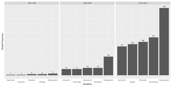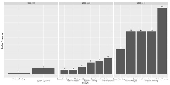 The named entity recognition model returned 2656 entities related to academic disciplines from 638 articles. As seen in Figure 3, the term “management” was among the top five discipline entities in 38.2% of the articles, followed by “government” (19.6%), “education” (18.5%), “agriculture” (16.2%), and “design” (16.2%). Among terms associated with complex systems science, “simulation” appeared in the top five terms of 10.9% of the articles, followed by “system dynamics” (6.5%), “action research” (4.4%), “complex systems” (3.4%), “social network analysis” (3.3%), and “systems science” (0.9%).