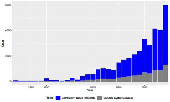 Furthermore, as the analysis progressed, it became evident that community-based research topics demonstrated a higher rate of growth compared to complex systems science. This observation suggests that community-based research not only had a higher initial presence but also experienced a more substantial increase over time within the corpus.