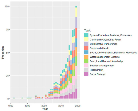Additionally, Figure 7 visualizes the relative proportion of these topics from 1975 to 2019. This figure demonstrates how the 10 topics varied in their appearance within the corpus over time. Overall, this figure illustrates an increasing trend in the occurrence of these topics, with a few exceptions. This indicates that the topics became more prevalent in the literature as time progressed, suggesting a growing interest and engagement with these areas of research.