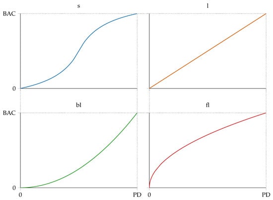 Task schedule refers to the tasks’ start and end dates. Following the activity-based costing method [49], the task schedule determines the cumulative cost curve, which represents the total project cost as a function of time. Let and indicate the project budget at completion and planned duration, respectively. Then, the project cumulative cost curve can assume one of the four typical profiles in Figure 1 [50].