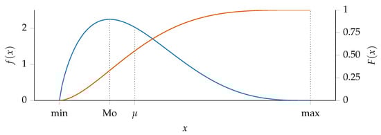 Let x denote the task cost deviation. Then, Equation (1) provides the PDF of the PERT distribution: