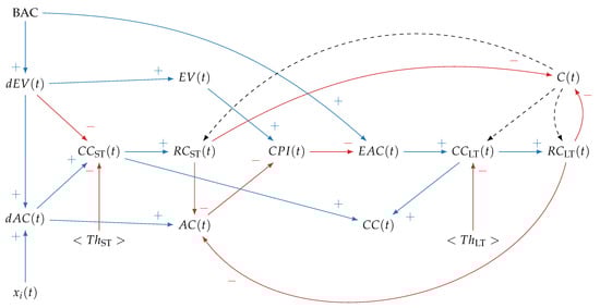 The CLD is defined as follows. The argument t, used as the simulation clock, indicates the tth project review, ranging from 0 (project start) to (project end). At any given t, tasks executed determine the increment in work performed (). Relating to the provides the increment in the budgeted cost of work performed (). In contrast, relating to the x determines the increment in actual cost () incurred to perform . The cumulative sum of provides the accrued earned value (), while the cumulative sum of provides the accrued actual cost ().