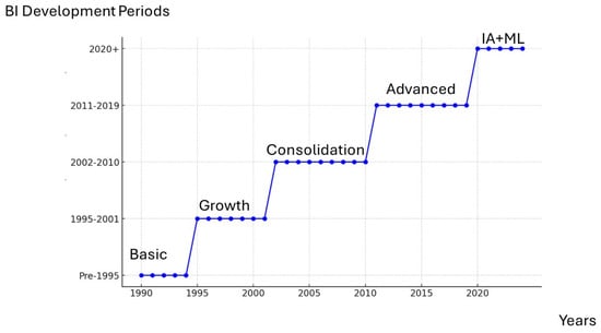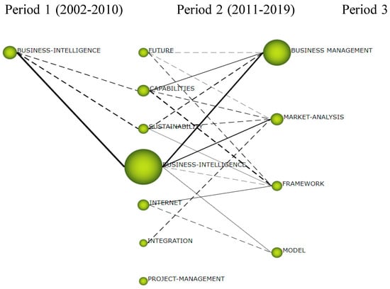 - Strategic Integration and Evolution: Initially emerging as a nascent field, BI has gained a prominent place in organizational strategy. The bibliometric analysis across three distinct periods reveals a shift from BI as a concept of academic interest to a critical component of strategic decision making in businesses. This evolution reflects the growing recognition of BI as a tool for not only understanding and managing data but as a strategic asset that informs and shapes corporate decisions. In this sense, some authors consider that Business Intelligence (BI) is a tool that supports proactive strategic management and decision making by producing actionable information that enables the identification of emerging changes and frontline employees as a valuable intelligence asset [5];