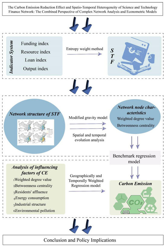 This study enriches the research content in the field of STF and broadens the research scale of CE, which is of theoretical significance for the scientific understanding of the topic of “how the location and function of science and technology finance network nodes affect carbon emission”, and of great practical significance for the promotion of inter-regional carbon emission reduction effect and low-carbon green development. The main contributions and innovations of this article are as follows: firstly, from a micro and relational perspective, we constructed the STFN based on the modified gravity model, adopted the “relationship data” of the spatial network structure, and selected two representative indicators of network structure, namely the weighted degree value and betweenness centrality, as the core explanatory variables to be included in the econometric model to examine their impact on CE. Secondly, based on a GTWR model, the spatio-temporal heterogeneity of the factors influencing CE is explored, and the differences and correlations between different regions in the CE reduction effects of STFN are fully considered. Thirdly, due to the differences in the degree of economic development among different regions, this article explores the spatial evolutionary development of STFN on CE and the relationship between spatial effects from a spatial horizontal perspective, and further elaborates the inner mechanism of the impact of STFN on CE, to provide certain reference suggestions for CE reduction. The inclusive research framework is shown in Figure 1.