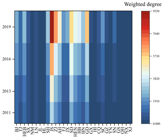 The spatial and temporal evolution of the weighted degree value of the STFN from 2011 to 2019 is shown in Figure 3 (because the core network screened out regions with lower network correlation than the average, the weighted degree value of the network in some regions was zero during the study period). On the whole, the weighted degree value of the study area gradually increased and the network association gradually strengthened during the whole study period. Among them, Jiangsu, Zhejiang, Shandong, and Guangdong have always been in the forefront and in the first echelon, occupying a core position in the spatial network correlation of STF, with strong radiation ability. The above regions are located in the eastern coastal areas of China, with superior geographical locations and rich scientific and technological financial resources. Anhui, Henan, and Hubei regions are in the second tier and have a strong driving force for the development of STF. These regions are located in the central region and play an important role in connecting the east and west and running through the north and south, and have gradually become an important hub for the development of STF in China.