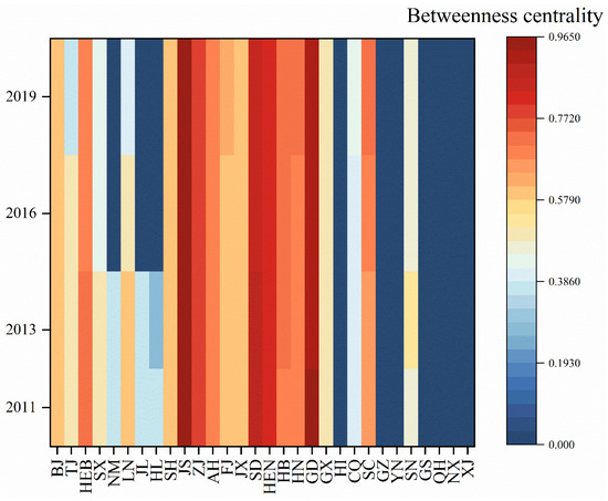The spatio-temporal evolution of the betweenness centrality of STFN from 2011 to 2019 is shown in Figure 4. On the whole, the betweenness centrality of Jiangsu, Shandong, Guangdong, Henan, and Zhejiang is always in the first echelon, showing strong control over other provinces. Hebei, Anhui, Hunan, Hubei, and Sichuan are in the second tier, while Beijing, Shanghai, Fujian, and Jiangxi are in the third tier. During the study period, the overall fluctuation of the betweenness centrality of the above regions was small, and the echelon structure did not change significantly, indicating that the central and eastern coastal areas had high mediating ability and played a strong role in resource allocation and control. Some northern provinces, such as Inner Mongolia, Shanxi, and northeast China, show a declining trend of betweenness centrality, indicating that their ability to control the correlation between other provinces is weakened, and they are in the edge position and controlled position of the network.
