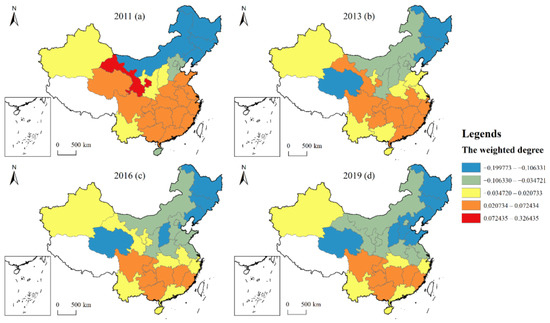 Spatial evolution of influence coefficient of the weighted degree value in 2011 (a), 2013 (b), 2016 (c), and 2019 (d).