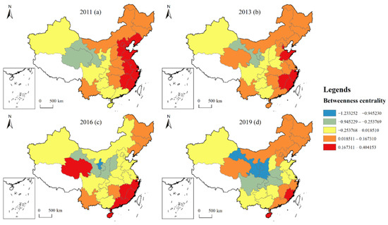 Spatial evolution of influence coefficient of the betweenness centrality in 2011 (a), 2013 (b), 2016 (c), and 2019 (d).