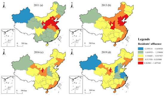 Spatial evolution of influence coefficient of resident affluence in 2011 (a), 2013 (b), 2016 (c), and 2019 (d).