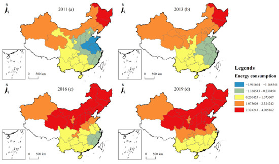 Spatial evolution of influence coefficient of energy consumption in 2011 (a), 2013 (b), 2016 (c), and 2019 (d).
