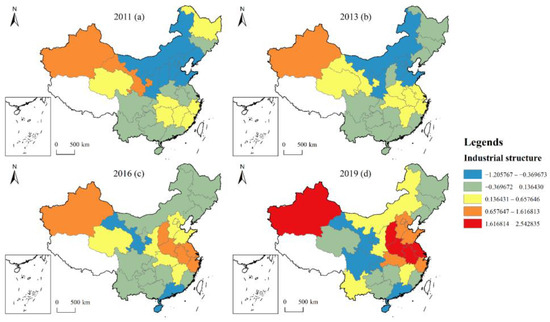 Spatial evolution of influence coefficient of industry structure in 2011 (a), 2013 (b), 2016 (c), and 2019 (d).