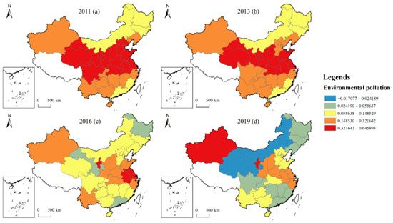Spatial evolution of influence coefficient of environmental pollution in 2011 (a), 2013 (b), 2016 (c), and 2019 (d).