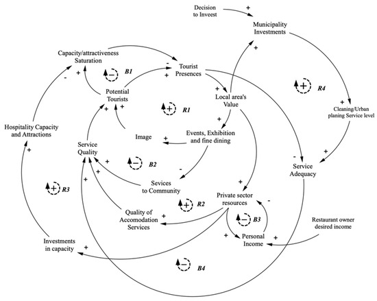 Loop R1 describes a process through which cultural events and fine dining drive town development and improve the image of the place, leading to the further exploitation of tourism potential as a source of value for the whole area. Also, tourism presence is sensitive to service quality. Based on this idea, business owners may decide to invest in improving the quality of accommodation services, reinforcing the tourism potential of the area (R2). Tourism development (loops R1 and R2) may find a limitation in local-area capacity, as portrayed by loop B1, and the fact that diverting the municipal budget from community services to events production may cause a decline in local-area service quality (B2). Whenever there is an increase in tourism presence, service adequacy decreases if decision-makers fail to increase the level of cleaning and urban planning services, for example. Municipal investments in service adequacy (R4) and private sector investments in hospitality capacity (R3) can both mitigate the effects of balancing loops, though the latter loop encounters a limit in the desired personal income by business owners (B3), which depletes business resources.