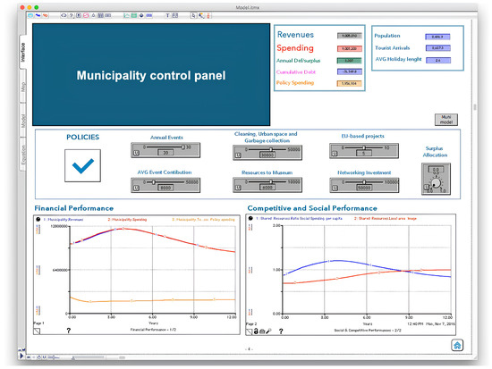 Given the dynamic complexity of a local area, using a protected environment through which stakeholders may experiment with causation analysis and reflective thoughts can be regarded as a preliminary step for enhancing the performativity of accounting practices. In fact, SD-based ILEs are designed to be used in training settings to support decision-makers’ discussions about a common, dynamic, and complex problem [87]. Such an interactive tool can be regarded as a “microworld” [78,88], allowing participants to engage in decision-making, simulation, and debriefing sessions of simulation outcomes while receiving guidance from a learning facilitator [40,83].