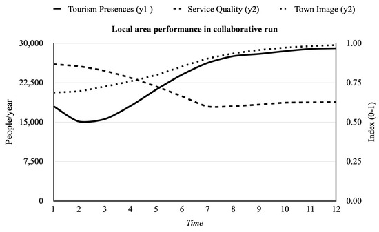 Figure 5 illustrates a drop in tourism presence and service quality from years 1 to 5, with a rise in the long run. This indicates an enriched stakeholder capacity to balance service quality and town image, eventually resulting in improved local-area tourism attractiveness in the long run. Decision-makers implemented cautious policies in the collaborative mode. Using the DPM insight model as a key to critically review the expected impact of their decisions on local-area performance. The model allowed decision-makers to focus on the interactions between the three performance domains at the organizational and inter-institutional levels. Such an improvement can be attributed to the performative practice of building a robust “cause-and-effects model” to guide performance analysis in specific debriefing sessions [82].