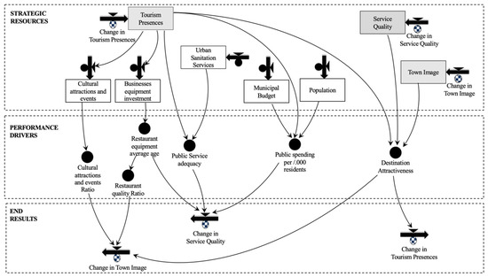 For the sake of clarity in illustrating the structure of the model, the main feedback determining model behavior is portrayed in Figure 2 as a causal-loop diagram [75]. Detailed information concerning the model structure, variables, equations, properties, and units of measure are provided in Appendix A, articulated in model modules. The purpose of the model is to capture the main relationships affecting three key results domains in a governance context: economic performance (i.e., tourism development), social performance (i.e., service quality), and competitive performance (i.e., town image). Initial values for key variables and parameters, as well as the flow equations representing real-world decision-making rules, were based on primary sources of information [77], i.e., interviews, budgets, and consolidated inter-institutional agreements [46].