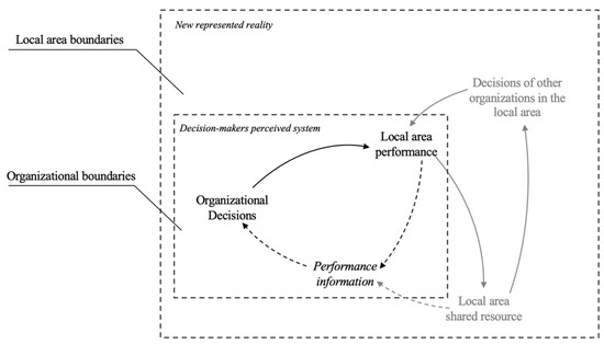 Being deceived by only an organizational point of view, decision-makers do not perceive that local-area performance influences local-area shared resource endowment, which, in turn, feeds back to their organizational decisions. The system’s boundaries can be extended if organizational decisions are sourced with performance information concerning local-area performance and shared resource endowment. This requires understanding the interdependencies among decisions of other organizations operating in the context, local-area performance, and the set of shared resources pertaining to the inter-institutional setting, i.e., the outer dashed section in Figure 6. DPM has proven beneficial in helping decision-makers grasp such a system’s structure, which is out of the reach of the “from the window” organizational point of view of performance analysis. As advocated in this work, it requires deepening the perspective of performance analysis through DPM to utter a “new represented reality”, which positions each organization in a much more complex inter-institutional setting.