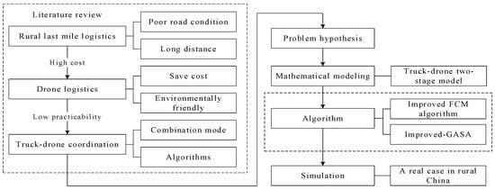 The research structure shown in Figure 1 summarizes the systematic method employed to address the complexities of last mile logistics in rural areas, offering a new perspective for integrating truck and drone transportation to enhance efficiency and reduce costs. The rest of the paper is organized as follows. Section 2 reviews the research literature on three key aspects: rural last mile, drone logistics, and truck–drone combined transportation. It highlights the current research shortcomings in these areas. Section 3 and Section 4 describe this problem in digital form and establish a mathematical model according to the distribution situation of the last mile in rural areas. Section 5 explains the two−stage path optimization algorithm used in this article. In Section 6, MATLAB simulations are conducted using real data from an area in rural China, and the experimental results are illustrated. Section 7 summarizes the main findings of the contribution and provides directions for future research.