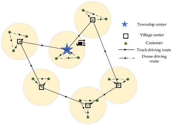 The specific two−stage transportation and distribution method can be divided into two stages. In the initial stage, taking into account the actual distribution of villages, multiple villages are considered as a cluster. Trucks departing from the township distribution center sequentially travel to each cluster center with packages and drones before returning to the township distribution center. The second stage involves the truck halting at the village gathering center, where the drone is deployed to commence its delivery mission. The drone will return to the truck after all delivery tasks are completed. When all the delivery tasks are completed, the trucks and drones will return to the distribution center. In the vicinity of the township distribution center and customers within the transportation range of drones, the drones directly start from the distribution center and transport packages to the customers. The schematic diagram of the two−stage transport model is shown in Figure 2.