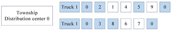 Suppose there are two delivery trucks, each of which carries out the delivery tasks while meeting the capacity and mileage restrictions. As a result of the first stage, truck 1 starts from the township distribution center and provides distribution services to rural distribution centers numbered 2 and 5. When the truck stops at the distribution center of village 2, the drone provides delivery services for customer 1 and 4 within its distribution range. Similarly, when the truck stops at the distribution center of village 5, the drone provides delivery services to customer 9 within its delivery range. Starting from the township distribution center 0, truck 2 first provides distribution services to village distribution center 3, and then provides services to village distribution center 8. This drone provides delivery services for customers 6 and 7 within its delivery range. The coding method of this hypothesis is shown in Figure 3. Trucks sequentially transport packages from left to right, and the delivery points for trucks are indicated by the same color. When the truck comes to a stop, the drone completes delivery to the respective customers. A comprehensive delivery route encompasses both the path of the truck and those of the drones. The code diagram is as shown in Figure 4.