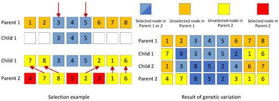 - Genetic operators: selection operators, crossover operators, and mutation operators. The tournament method is used to select individuals with high fitness in the current population, and offspring are generated using sequential crossover with probability . To maintain the diversity of the population, individuals are mutated with probability , and the fitness of individuals in the new population is calculated as .