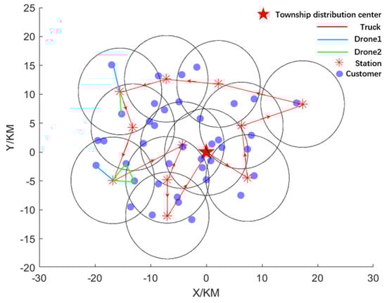 According to the solution results of the first stage of the algorithm, the delivery route numbers of each delivery vehicle are found, in turn, to form a chromosome sequence subsequence. According to the position of the vehicle’s delivery point in the chromosome sequence, the chromosome is divided into several segments. Gene sequences within the clustering range of the truck’s delivery point are delivered by drones, and the starting point of drone delivery is the truck’s current delivery point. If the distance between the chromosome number and the township distribution center is within the delivery range of the drone, the delivery will be completed directly by the drone.