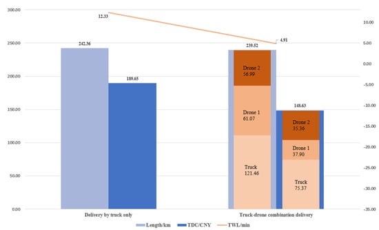 Compared with traditional truck transportation mode, drones have the advantages of fast transportation speed, high flexibility, low carbon, and environmental protection in rural areas, but it also has the limitations of short transportation distance and battery capacity. Thomas Kirschstein pointed out that from an energy perspective, in most cases it is not worthwhile to switch to a drone−based parcel delivery system alone, and in rural settings, a drone−based parcel delivery system incurs an energy demand similar to a parcel delivery system using electric trucks, assuming moderate environmental conditions [30]. Aishwarya Raghunatha found that when transporting goods in rural areas, the emissions generated by large drones are lower than those of diesel trucks, and drones cannot compete with electric trucks, mainly because the energy requirements for taking off and landing of drones are higher. Notably, electric drones are more economically cost−effective than road transport modes such as diesel and electric trucks but provide the fastest delivery times [31]. Using real−world delivery demand data, Elsayed simulated the drone and ground delivery modes of all−day parcel delivery services in urban and rural areas, and found that compared to the emissions generated by ground transportation, the emissions generated by drones were significantly reduced, and compared with those generated by electric vehicles, the emissions increased by 35% [32]. These studies demonstrate the feasibility of utilizing drones for logistics in rural areas. However, considering the issue of carbon emissions, simple drone delivery is not as effective as using electric vehicles for transporting goods. Therefore, an alternative approach would be to employ a combination of truck and drone transportation.