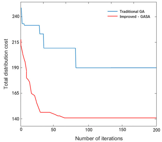 The simulated annealing algorithm is a probability−based optimization algorithm, which is inspired by the solid annealing principle. It takes a single individual as the object and iterates on the basis of the previous generation. The algorithm shows strong local convergence but lacks global search capability. Therefore, combining these two algorithms, a hybrid genetic simulated annealing algorithm [59,60] is designed to optimize the joint delivery route problem of truck and drones, improve the efficiency of solving, and select reasonable delivery routes until the trucks pass through all the village distribution centers and meet all customer needs. The specific operating steps of the genetic simulated annealing algorithm are as follows: