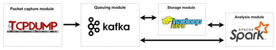Based on the architecture presented in Figure 1, a literature review followed, allowing to choose the best tools and technologies to support each architecture module. As represented in Figure 2, the choices landed on tcpdump for the packet capture module, Apache Kafka for the queuing module, Apache HDFS for the storage module, and Apache Spark for the analysis module. The literature review that led to these choices is presented next.