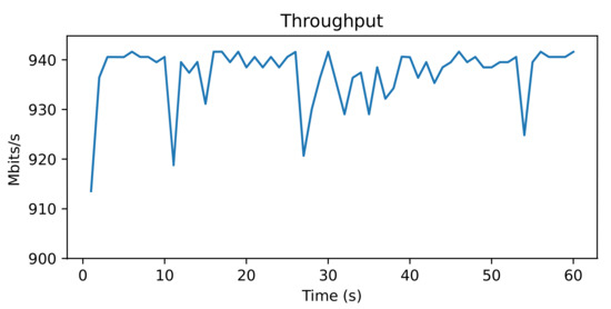Due to the characteristics of the testbed, the network captures on Network A were limited to a nominal maximum of 1 Gbps. However, before beginning the evaluation of the architecture, a test was made to verify what was the effective maximum bandwidth achievable between the workstations. The test consisted of running the iPerf3 [41] benchmark for 60 s, to measure the bandwidth of a single TCP connection between the workstations. The actual throughput can be found in Figure 4, with most values sitting between 930 and 940 Mbps. These values set a ceiling for the expected probe capture rate.