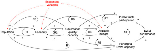 We used a Causal Loop Diagram (CLD) that was recently developed for simulating underlying processes on the performance of waste collection at the city level in developing countries [33]. This CLD, given in Figure 1, uses six state variables: population size, economic production, governance quality, available government budget, and public participation. The model uses fifteen relations and eight feedback loops to describe how these variables influence each other and how they eventually influence the target variable, which is SWM (solid waste management) performance. The model also assumes the agency of exogenous variables; factors from outside the system that have an influence inside the system, such as the world economy.