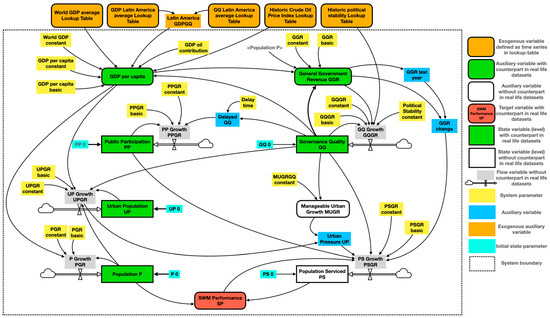For our use, we adapted this model to our research. The first adaptation is the target variable, SWM performance. We defined this as the percentage of the total population that has access to municipal waste collection. More adaptations were needed to turn the city-level model into a country level one. For this, we included variables on the total population, urban population, and processes of urbanization. The CLD was finally translated into the Stock and Flow Diagram (SFD) given in Figure 2. The dotted line gives the boundaries of the system, i.e., the country. The orange boxes are outside the system, and they represent the exogenous factors that play a role being: the world economy, the regional economy, the regional quality of governance, the historic crude oil prices, and the history of political stability. The upper part of the system itself gives the clusters on the national economy and the national government revenues. Below, the clusters on public participation and governance quality can be found. In the lower left corner is the clusters of the (urban) population. In the lower right corner is the cluster on the number of serviced citizens. Population and population serviced lead to the target variable (in red).