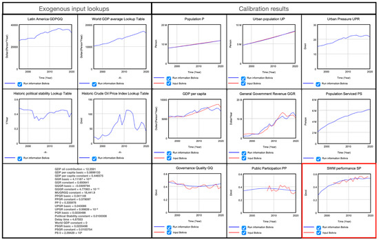 Example of results using Vensim, in this case for Bolivia, with the calibrated parameter set as given in Table 2. The left-hand side is the input time series used for the exogenous variables. On the right-hand side, 7 diagrams are shown for the simulated variables (blue lines) that are calibrated against real-life data (red lines), along with 2 diagrams for the auxiliary variables that are also calculated during simulations. The red-framed diagram provides the diagram for the target variable SWM performance SP. See Appendix B and Appendix C for a description of all acronyms.