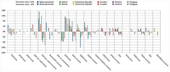 The sensitivity analysis yielded the results, summarized numerically in Table 3 and graphically in Figure 4. Apparently, the strongest sensitivity of the target variable is for the parameters on GDP, government revenues, and governance quality and, to a lesser extent, for those on population growth and public participation.