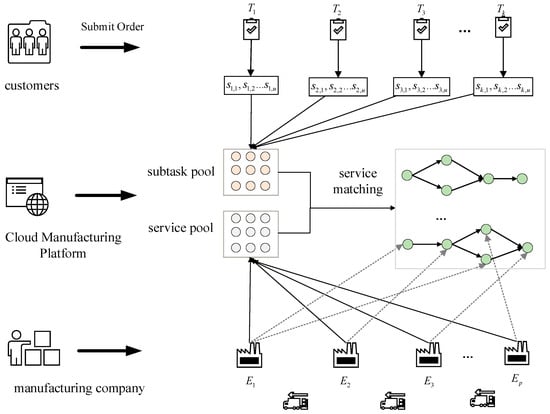 In recent years, with the development of related theories and technologies, manufacturing service allocation and scheduling under cloud manufacturing have attracted the attention of a wide range of scholars [2], and in the face of large-scale manufacturing tasks from multiple users, how to optimise resource allocation and scheduling to satisfy users’ needs has become a research hotspot. Zhang et al. [3] proposed a synergistic elementary service-group-based service composition (SESG-SC) approach, which allows multiple functionally equivalent elementary services to be freely combined into one SESG to jointly perform each subtask, improving the overall service quality. E.V. Goodarzi et al. [4] proposed a mathematical model of the manufacturer’s portfolio based on game theory and proved that in the cooperative game model, the profit and the quality of service gained by the manufacturing service provider are greater than those in the non-cooperative game model. Qian et al. [5] designed a collaborative cloud platform to provide an optimal production schedule by considering the cost, time, quality, and energy issues in the manufacturing process. Omid Fatahi Valilai et al. [6] performed scheduling optimisation based on the customised requirements of dentistry by considering the completion time and total completion time as the optimisation objectives. Jian et al. [7] developed relevant mathematical optimisation models based on the dynamic implementation of the tasks in the cloud manufacturing to save the shop floor production time and cost. Liu et al. [8] developed a multi-objective mathematical model to minimise the total cost, carbon emission, and water resources from economic and environmental perspectives while meeting time, cost, and quality requirements. Mehdi Zeynivand et al. [9] used the concept of alternative process routing for task decomposition, which enhances the flexibility of the system to complete resource allocation, and task delivery at the lowest cost. Hu et al. [10] established a scheduling metric assessment based on five aspects, task loadability, task reliability, manufacturing efficiency, manufacturing resource richness, and IoT matching, and used the AHP method to determine the relative weights of each factor at each level to transform the multi-objective optimisation into a single-objective problem, improving timeliness of the cloud manufacturing platform. Li et al. [11] studied the task scheduling of industrial robots under different enterprises under cloud manufacturing and proposed three sub-task scheduling strategies based on the three optimisation objectives of balanced robot load, lowest total cost, and shortest total processing time, which were realised by genetic algorithms. Tong et al. [12], based on the irrational characteristics of the users, used the prospect theory in psychology to compute the user’s satisfaction level for the tasks corresponding to advancement or delay satisfaction.