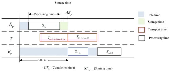 Since each manufacturing service provider in cloud manufacturing is geographically dispersed, the transport time required by the vehicles is non-negligible, so we consider two cases of the number of vehicles, which are finite and infinite. And if the manufacturing service provider completes the sub-tasks if they cannot be transported immediately, they are put into the warehouse for storage. When sub-task is processed at manufacturing service provider , whether its subsequent sub-task can start immediately depends on the processing progress of another manufacturing service provider , on the one hand, and on the transport time of sub-task . And when the available time of the vehicle under the manufacturing service provider is less than the completion time of the subtask, the subtask is put into the storage area until a free vehicle is available. As shown in Figure 2.
