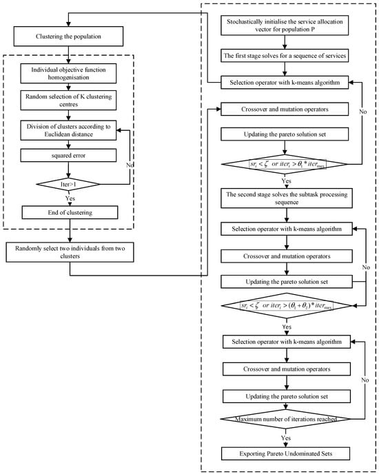 In the first stage, only service allocation and cost constraints are considered. The initial population p is randomly generated based on the attribute consistency principle, and based on the k-means algorithm, the individuals are selected at different clustering centres, and then, the service vectors of each individual are cross-mutated to update the Pareto non-dominated solution set, as well as the non-dominated solution set, according to the Pareto method.