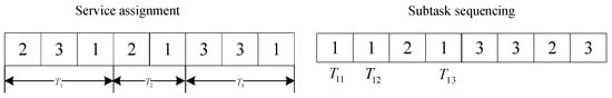 The chromosome is encoded in an integer, and the length of the chromosome string is 2 S. The first part indicates the service assignment, and the change service can process the corresponding subtasks. The second part indicates the processing order of all subtasks. For example, in MS = (2 3 1 2 1 1 3 3 1), the first ‘2’ indicates that the first subtask of task 1 is assigned to the second manufacturing service provider for processing. The second layer is the subtask ordering, where each element represents a subtask of the corresponding task, and the nth occurrence of the same number indicates the nth subtask in the sequence of tasks. For example, for sequences = (1 1 2 1 3 3 2 3), the first ‘1’ represents the first subtask of the first task. The second ‘1’ represents the second subtask of the first task, and the length of the encoding is determined by the number of subtasks. The length of the encoding is determined by the subtask’s. The encoding is 2312133111213323, The service sequence is which represents the scheduling scheme as shown in Figure 4.