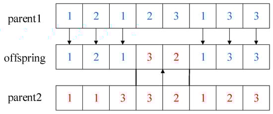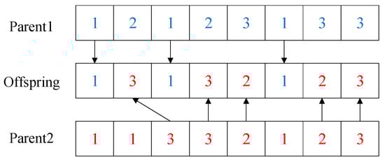 For subtask ordering sequences, order-based priority-preserving crossover is used. Two different parent individuals from the current population were selected as the basis for crossover, and one or more crossover points were randomly selected in the aligned sequence of parent individuals. The gene segments between the crossover points were copied from one parent individual to the corresponding positions in the offspring, and the remaining blank positions were sequentially complemented by the remaining elements of the other parent individual, as shown in Figure 6. Blue numbers indicate genes from parent 1 and red numbers indicate genes from parent 2 in Figure 6.