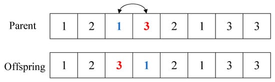 For the subtask sequencing sequence, the mutation process will be carried out on the basis of the crossover operator by using the two-point mutation, where an individual is randomly selected from the current population as the object to carry out the mutation operation. Two mutation points, i.e., the gene positions where the mutation is to be performed, will be randomly selected in the chromosome of the selected individual and the two mutation points will be exchanged. The above mutation method avoids the generation of infeasible offspring, as shown in Figure 8. The blue and red numbers in Figure 8 represent the two different mutant genes that were selected.