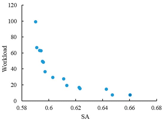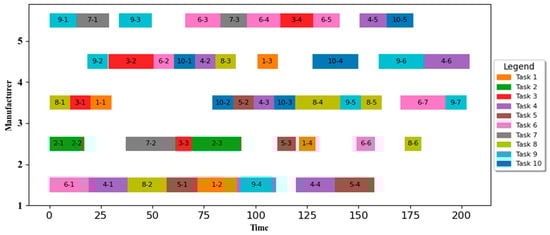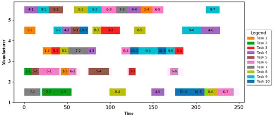 Similarly, to better illustrate the necessity of scheduling optimisation research for both supply and demand sides, the ISGA is used for solving the problem, and the optimisation objectives are set to o total completion time, total cost, and total quality, while using the case data. The results of 20 scheduling optimisation solutions are summarised, from which the optimal solution is taken out and a Gantt chart is drawn based on the obtained scheduling. As shown in Figure 14, the blank space between processes indicates that the manufacturer’s processing machine is in an idle state, and comparing the two Gantt charts, it can be seen that the workload is more balanced under the resource scheduling optimisation model oriented towards the supply and demand sides; the resource utilisation rate under the two scenarios is shown in Table 12, and when load balancing is taken into account, the lowest resource utilisation rate of the manufacturing service provider is 71.20%, the highest reaches 93.94%, and the average resource utilisation rate is 76%, while the highest resource utilisation rate of the manufacturer is only 72.56% when load balancing is not considered, and the resource utilisation rate of some manufacturers is less than half, with an average resource utilisation rate of 62.83%. This shows that resource utilisation can be improved when load balancing is considered.