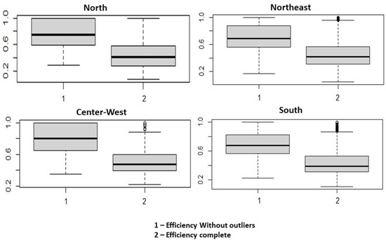 The regions had higher means, medians, and interquartile ranges of the uncorrected data than the corrected data. In this way, the most robust data are obtained. Table 5 contains the descriptive statistics of the efficiencies calculated with outliers, without outliers, and with correction without outliers.
